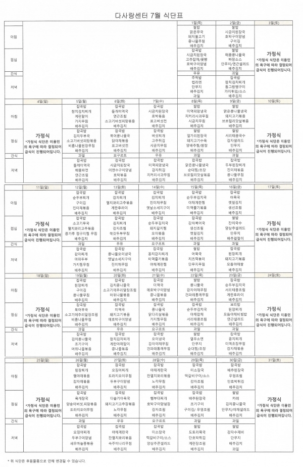7월 식단표 페이지 정보 작성일 : 21-07-26 09:20 조회 : 1,097회 관련링크 본문 식단표게시가 많이 늦었습니다~ 댓글목록 등록된 댓글이 없습니다. 이전글 다음글 목록