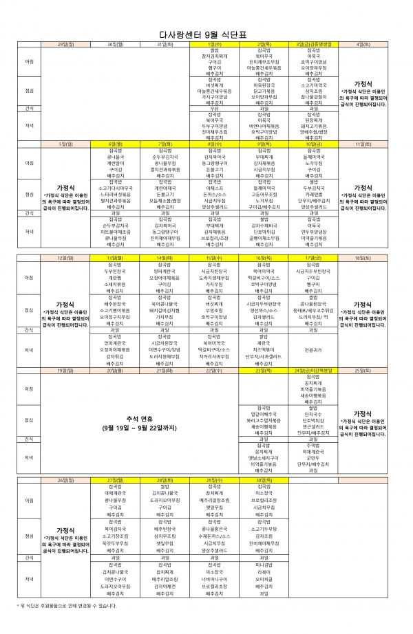 9월 식단표 페이지 정보 작성일 : 21-08-27 17:09 조회 : 1,079회 관련링크 본문 다사랑센터 9월 식단표입니다. 댓글목록 등록된 댓글이 없습니다. 이전글 다음글 목록