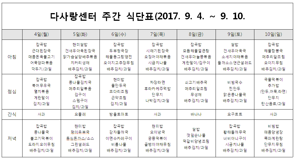다사랑센터 주간 식단표(2017. 9. 4. ~ 9. 10.) 4일(월) 5일(화) 6일(수) 7일(목) 8일(금) 9일(토) 10일(일) 아침 잡곡밥 근대된장국 매콤돈육불고기 어묵양파볶음 깍두기/과일 현미쌀밥 건새우아욱된장국 닭가슴살양배추볶음 치커리생채 배추김치/과일 잡곡밥 두부청국장 해물동그랑땡전 오이지고추장무침 배추김치/과일 잡곡밥 시래기된장국 오징어야채볶음 시금치나물 배추김치/과일 잡곡밥 모듬해물얼큰탕 건새우마늘쫑볶음 계란말이/김구이 배추김치/과일 쌀밥 건새우아욱국 소세지야채볶음 들깨소스연근샐러드 배추김치/과일 잡곡밥 해물짬뽕국 메추리알조림 오이지무침 배추김치/과일 점심 잡곡밥 북어무우국 멸치볶음 계란말이 김치/과일 잡곡밥 콩나물김치국 메추리알볶음 김구이 스펨구이 김치/과일 현미밥 물만두국 코다리조림 곤약조림 김치/과일 짜장라면 후라카케주먹밥 단무지 나박김치/과일 쇠고기배추국 메추리알조림 무생채 배추김치/과일 비빔국수 찐만두 맑은콩나물국 배추김치/과일 국물떡볶이 추가밥 (만두,어묵,라면) 단무지 탄산음료/과일 간식 사과 요플레 방울토마토 사과 바나나 요구르트 사과 저녁 잡곡밥 콩나물국 불고기떡볶이 도라지오이무침 배추김치/과일 현미밥 팽이유부국 등심돈까스/소스 그린샐러드 배추김치/과일 잡곡밥 감자들깨국 이면수카레구이 비름나물 배추김치/과일 현미밥 오이냉국 궁중떡볶이 골뱅이야채무침 배추김치/과일 쌀밥 깻잎순나물 떡갈비양념조림 배추김치/과일 잡곡밥 황태들깨무국 너비아니구이 시금치나물 배추김치/과일 비빔밥 매콤양념장 쪽파계란탕 단무지무침 배추김치/과일