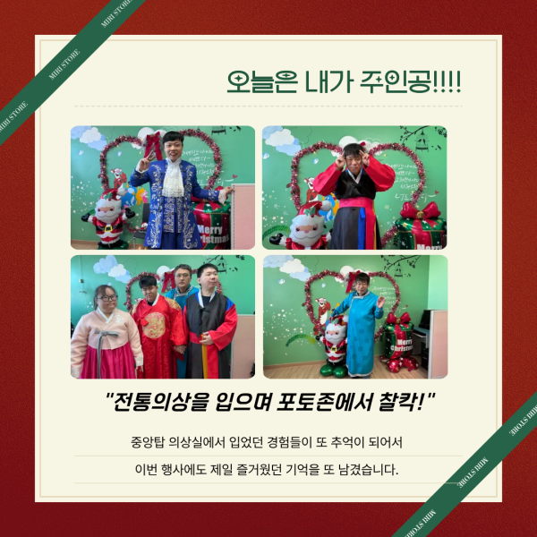 다사랑 송년회 페이지 정보 작성자 이하영 작성일25-12-04 17:23 조회320회 댓글0건 관련링크 본문 다사랑 송년회 프로그램을 통해 센터 이용인들이 즐겁고 알찬 행사를 참여할 수 있었습니다. 다사랑센터를 위해 후원해주시고 봉사해주시는 분들이 있기 때문에 이 자리가 마련되었던거 같습니다. 올해도 정말 감사했습니다. 댓글목록 등록된 댓글이 없습니다. 이전글 다음글 목록
