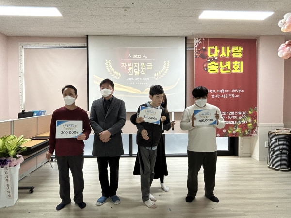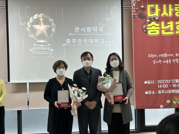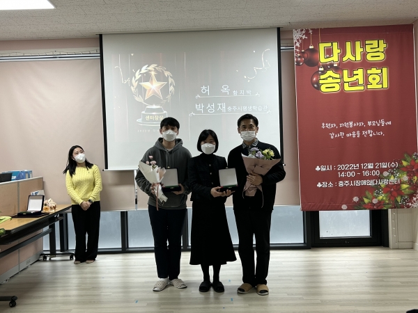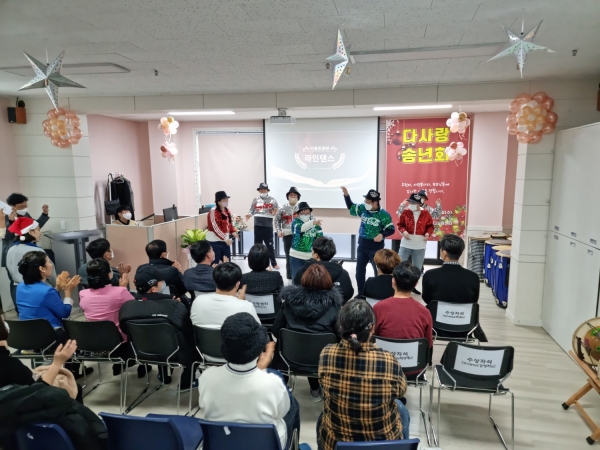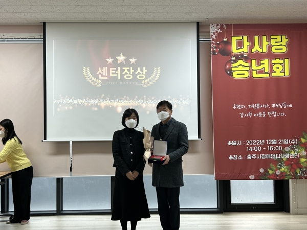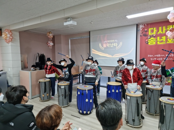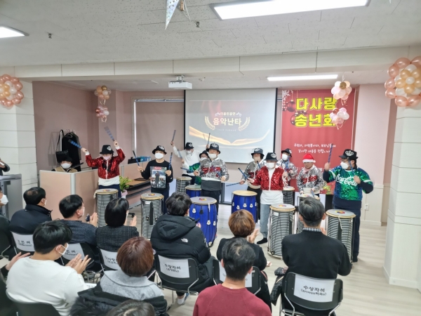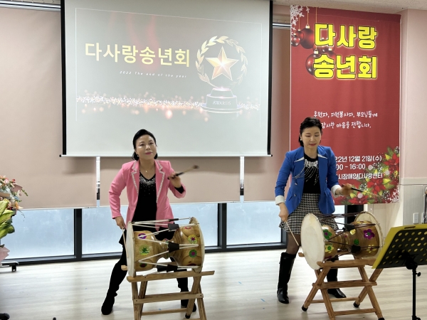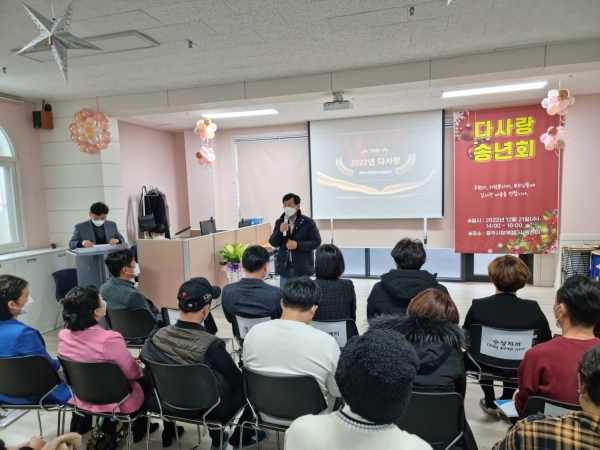 2022. 12. 21. 다사랑 송년회 페이지 정보 작성자 이하영 작성일22-12-21 18:26 조회1,049회 댓글0건 관련링크 본문 다사랑센터에서는 다사랑 송년회를 진행하였습니다. 장구공연으로는 이명옥 외 1명, 이용인 공연으로는 라인댄스, 음악난타를 진행하였습니다. 자립지원금 고**, 이**, 이** 이용인이 수상하였으며, 오라클피부과(국회의원상), 큰사랑 약국, 충주건국대학교 간호부(운영위원장상), 함지박, 충주시평생학습관(센터장상), 김인호위원(감사패) 전달하였습니다. 바쁘신 와중에도 귀한 발걸음 해주신 분들께 감사인사를 전합니다.^^ 댓글목록 등록된 댓글이 없습니다. 이전글 다음글 목록