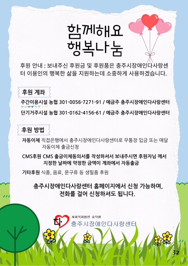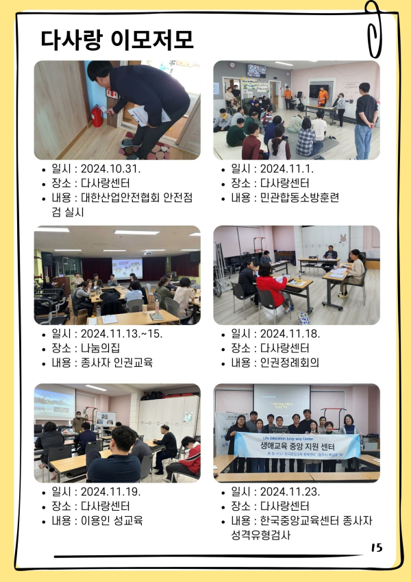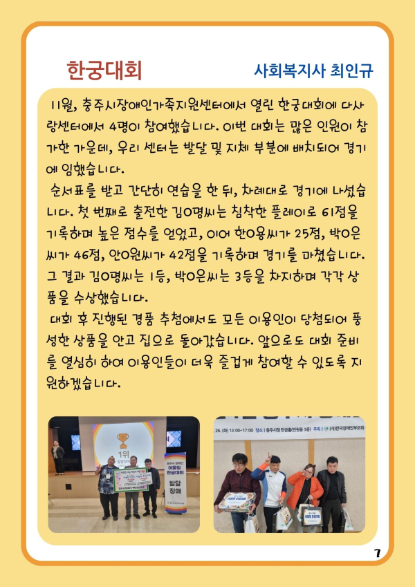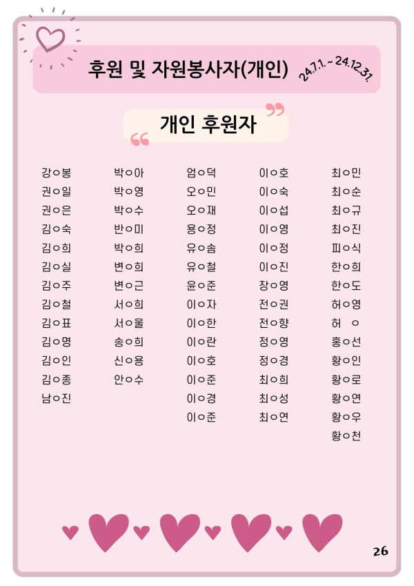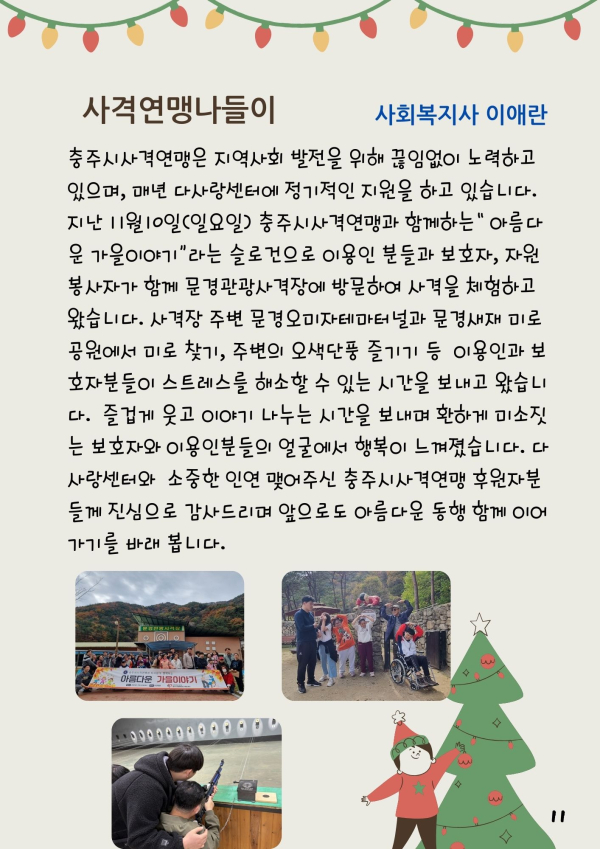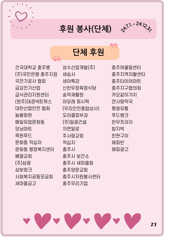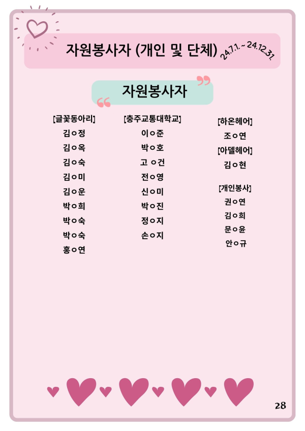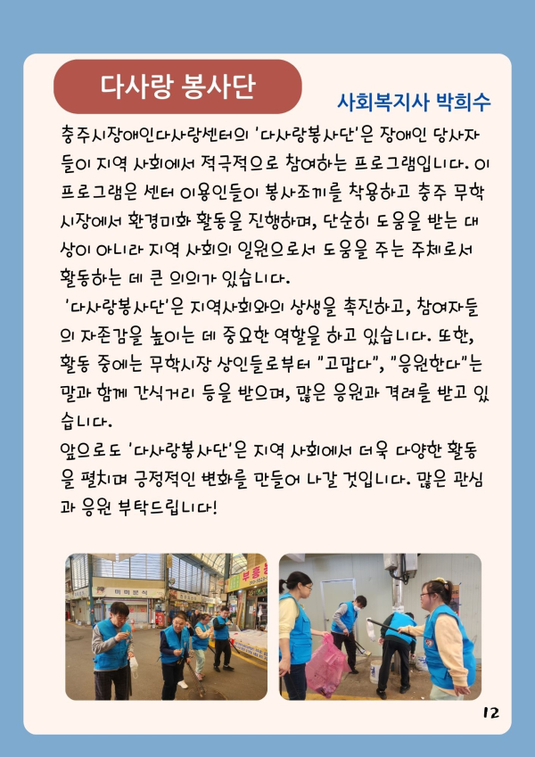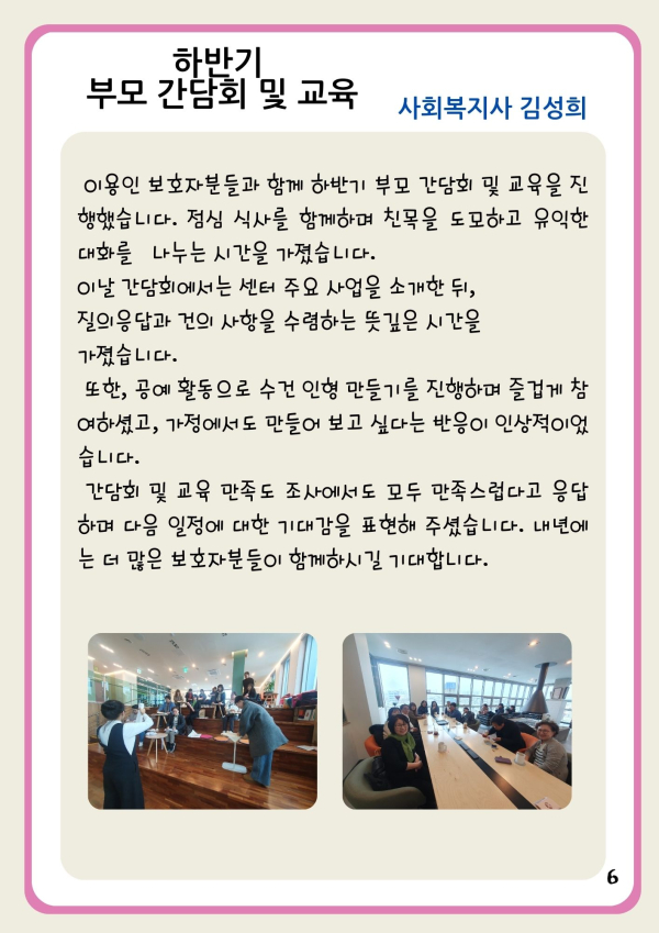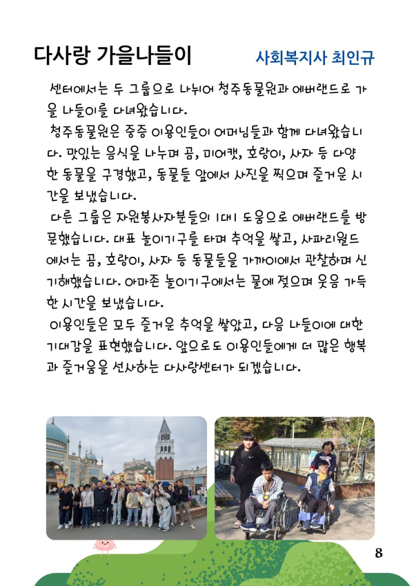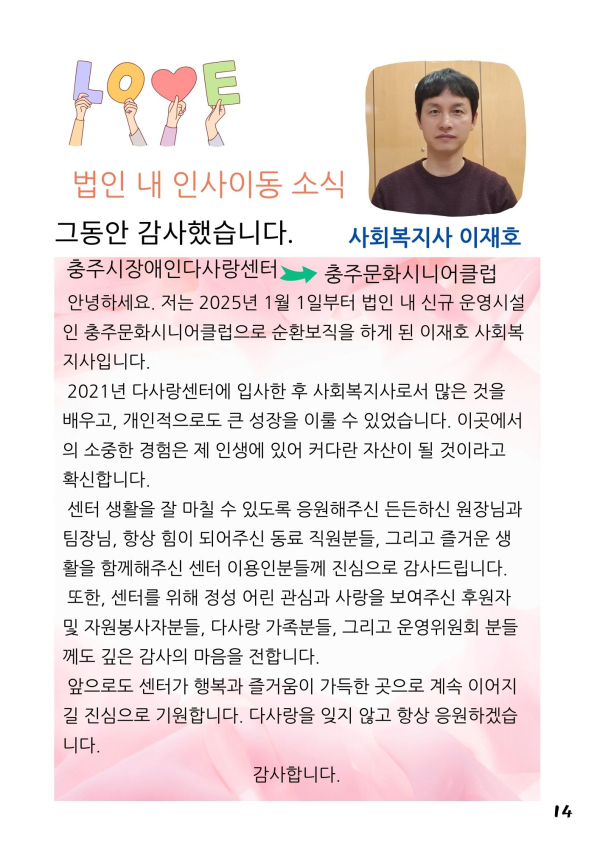 24년 다사랑 뉴스레터 '겨울호' 페이지 정보 작성자 최월순 작성일25-01-12 22:27 조회812회 댓글0건 관련링크 본문 2024년 다사랑 뉴스레터 '겨울호' 가 발행되었습니다. 지난 한해 많은관심 가져주신 모든 분들께진심으로 감사드립니다. 댓글목록 등록된 댓글이 없습니다. 이전글 다음글 목록