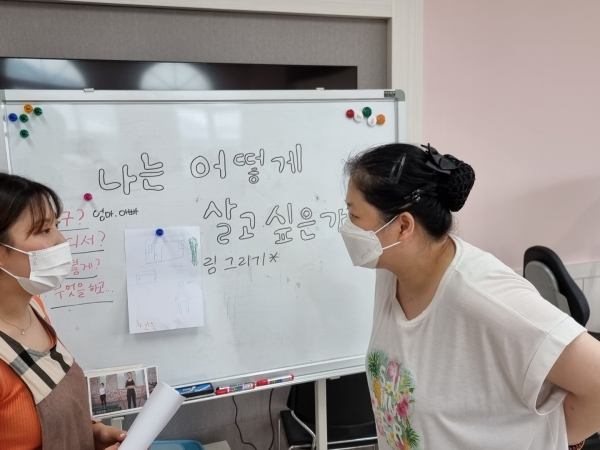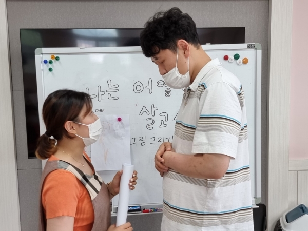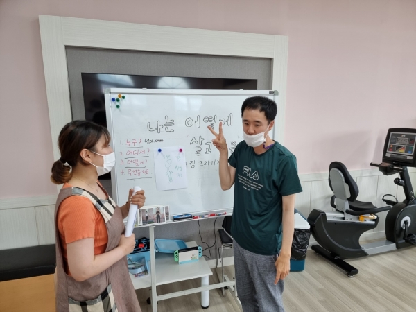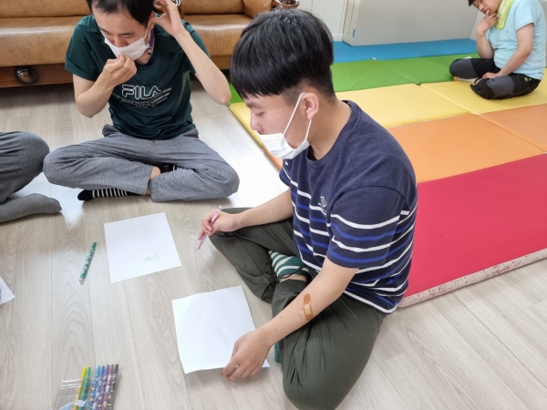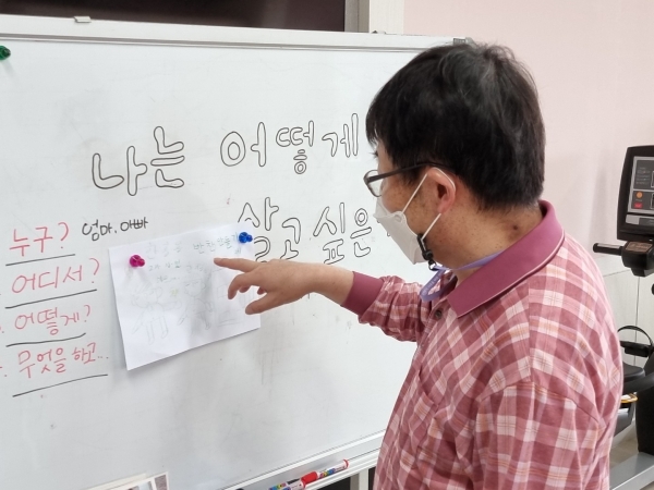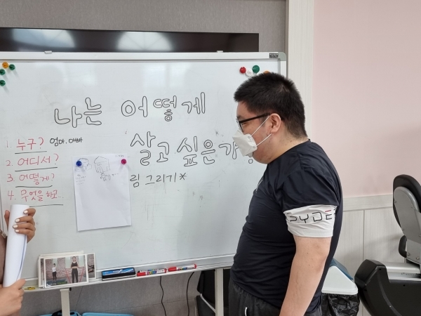 2021. 06. 10. PCP 사람중심실천 페이지 정보 작성자 이하영 작성일21-06-11 16:29 조회1,763회 댓글0건 관련링크 본문 PCP사람중심실천으로 이용인들이 원하는 미래의 삶을 그림으로 그려보았습니다혼자살고 싶은 분도 있었고, 친구랑 혹은 엄마, 아빠랑 살고 싶다고 하는 분들도 있었습니다. 또한 강아지, 고양이를 키우고 싶은 분들도 있었습니다.다그린 후에는 발표도 해보았습니다^^이제는 아파트, 주택 집이 아니라 누구와 어떻게 무엇을 하며 다사랑 이용인 각 개별로써의 의견을 존중해주며 본인이 원하는 삶을 살기를 원합니다^^ 조금씩 본인들의 꿈을 펼쳐 나갈 수 있도록 의견과 이야기를 들어줄 수 있도록 노력하겠습니다!! 댓글목록 등록된 댓글이 없습니다. 이전글 다음글 목록