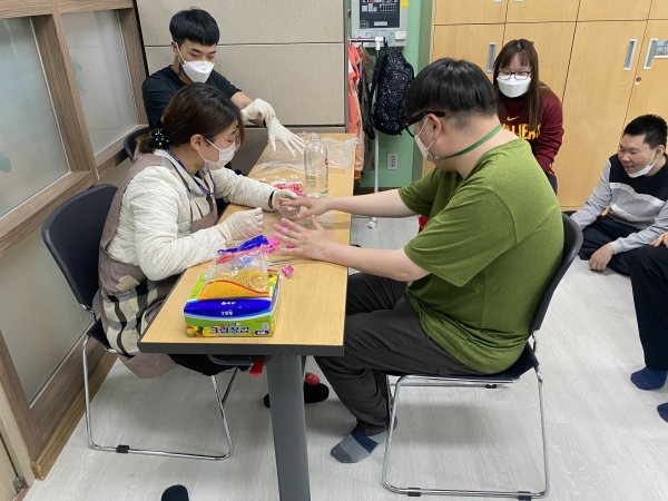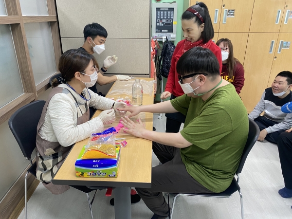 2021. 04. 13. 봉숭아 물들이기 페이지 정보 작성자 이하영 작성일21-05-21 11:59 조회1,872회 댓글0건 관련링크 본문 2021년 04월 13일봉숭아 물들이기를 진행하였습니다.봄을 맞이하여 손톱에 물을 들이며 산뜻한 기분을 느꼈습니다.이용인들이 한껏 기대를 하고 자신이 원하는 손가락에 하며 만족해하였습니다 댓글목록 등록된 댓글이 없습니다. 이전글 다음글 목록