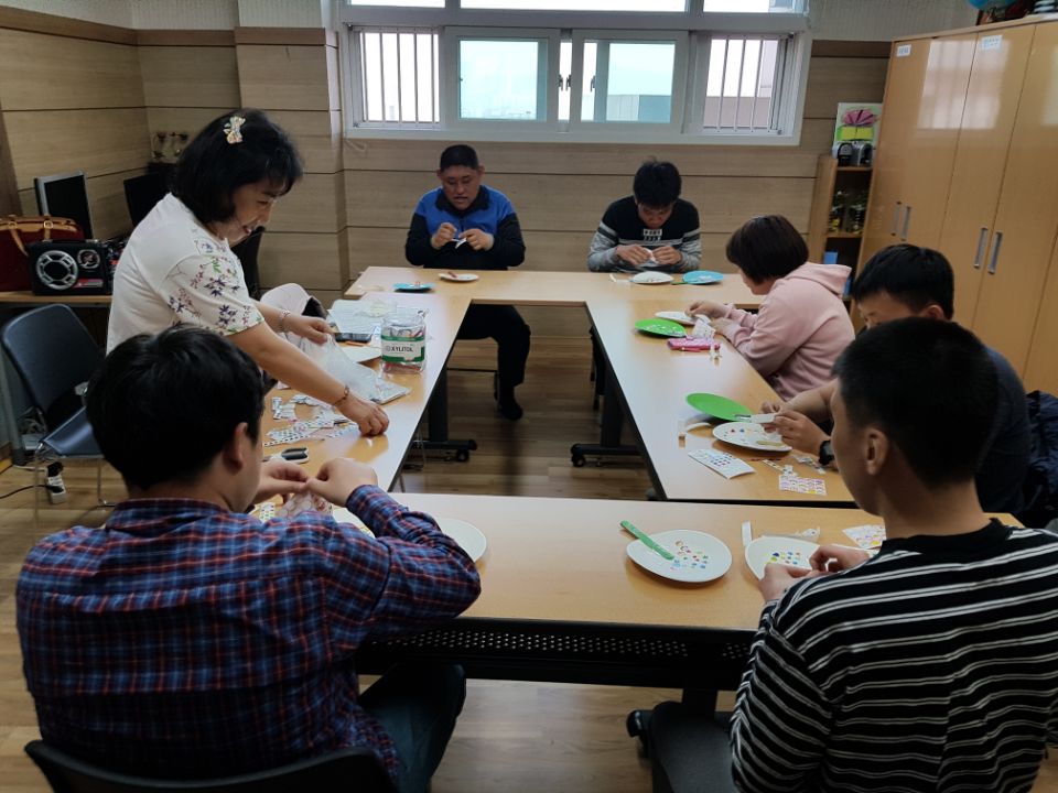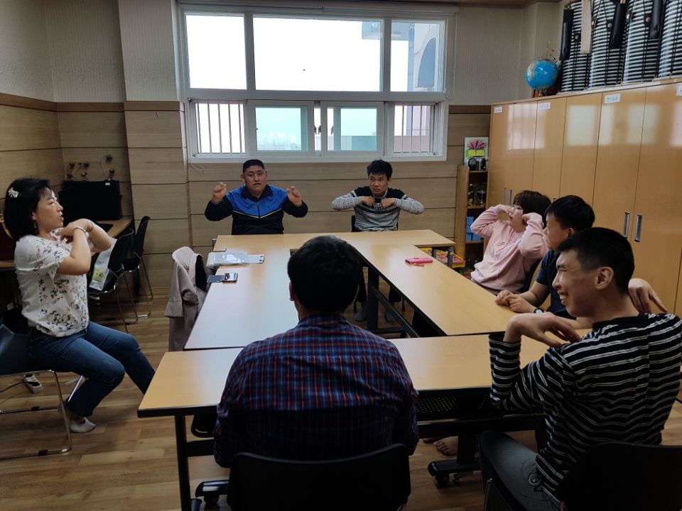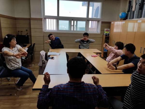1교시 웃음치료 시간에는 신나는 음악을 틀어 몸을 이완시킬 수 있는 스트레칭을 하고, 재활용품을 이용해 부채 만들기,풍선게임 등 알찬 수업이 진행되었습니다.