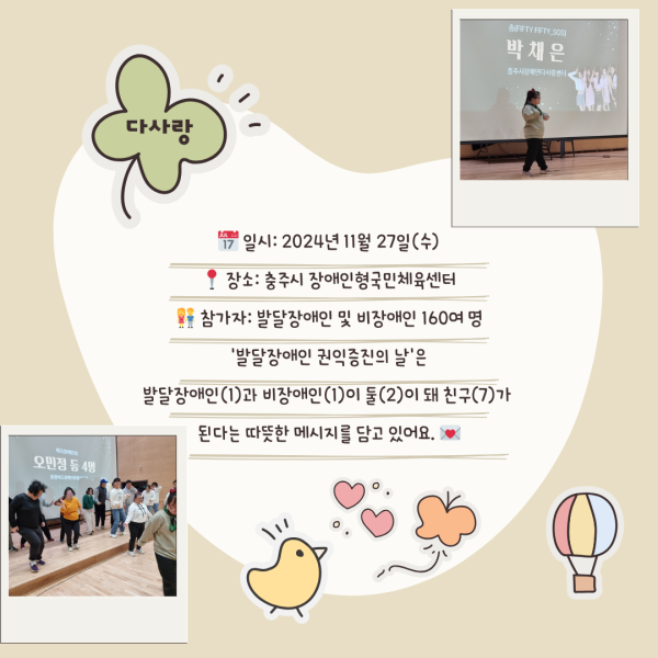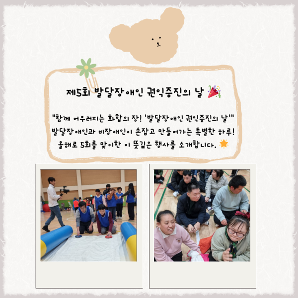'발달장애인 권익증진의 날' 11.27 페이지 정보 작성자 이재호 작성일24-11-29 21:56 조회628회 댓글0건 관련링크 본문 '발달장애인 권익증진의 날' 11.27 댓글목록 등록된 댓글이 없습니다. 이전글 다음글 목록