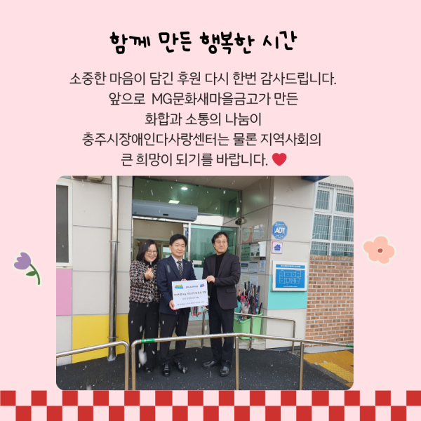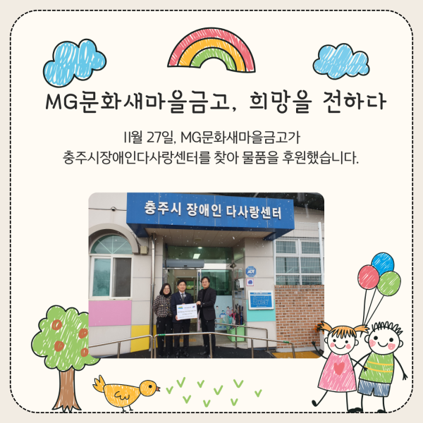 MG문화새마을금고, 충주시장애인다사랑센터에 MG희망나눔 마을공동체 물품 전달 페이지 정보 작성자 이재호 작성일24-11-30 02:18 조회618회 댓글0건 관련링크 본문 MG문화새마을금고, 충주시장애인다사랑센터에 MG희망나눔 마을공동체 물품 전달 댓글목록 등록된 댓글이 없습니다. 이전글 다음글 목록