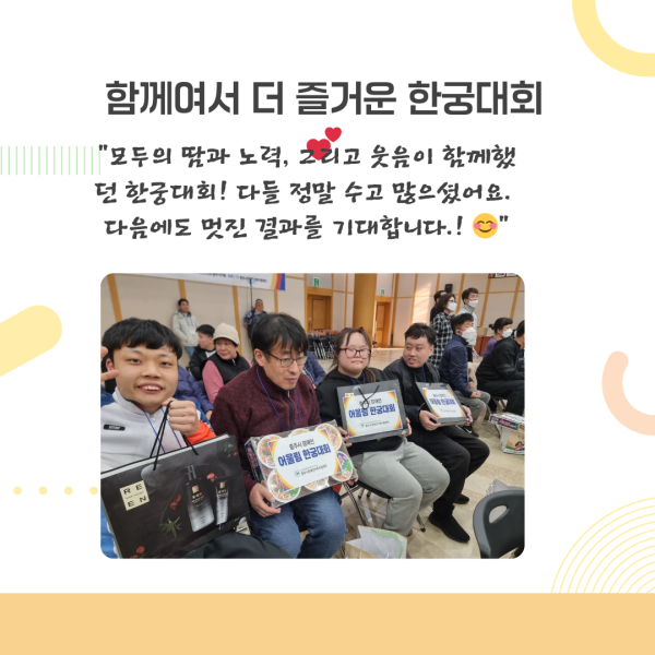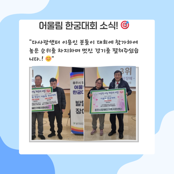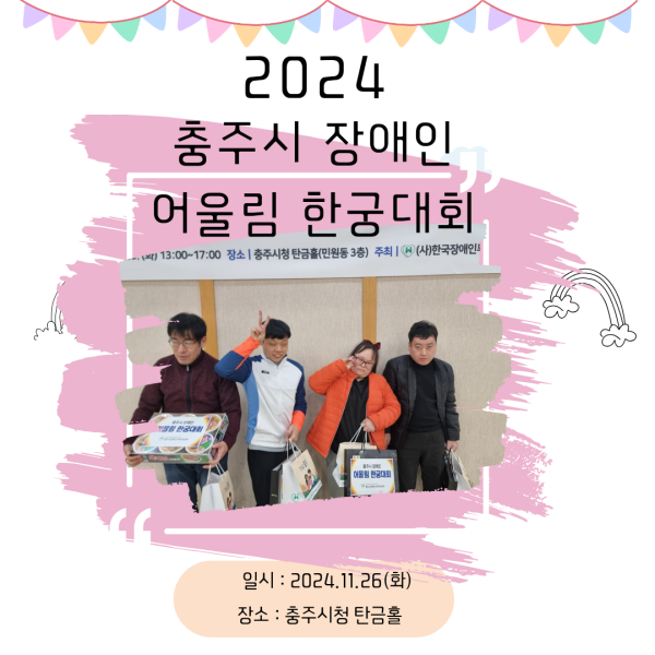 2024 충주시 장애인 어울림 한궁대회 소식! 페이지 정보 작성자 이재호 작성일24-11-30 03:01 조회704회 댓글0건 관련링크 본문 2024 충주시 장애인 어울림 한궁대회 소식! 댓글목록 등록된 댓글이 없습니다. 이전글 다음글 목록