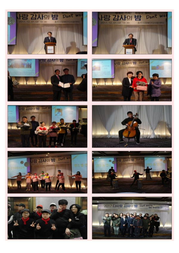 충주시장애인다사랑센터에서는 한 해 동안 이용인분들과 센터를 위해 물심양면으로 봉사와 헌신을 아끼지 않으신 후원자분들, 자원봉사자분들, 또한 언제나 센터를 사랑해주시고 격려해주시는 이용인 가족분들을 모시고 지난 12월 1일 호텔 더베이스 크리스탈볼룸에서 < Don't Worry~ Be happy!! >라는 주제로 다사랑 감사의 밤을 가졌습니다.