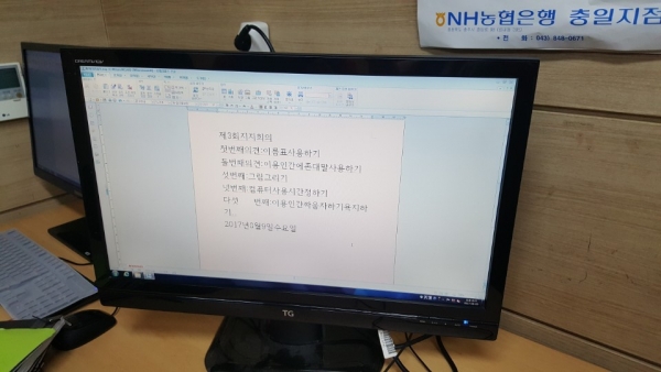 21세기에 걸맞게 정연태 회장님께서 컴퓨터를 이용해 요번 안건에 대해서 설명하고 있습니다.