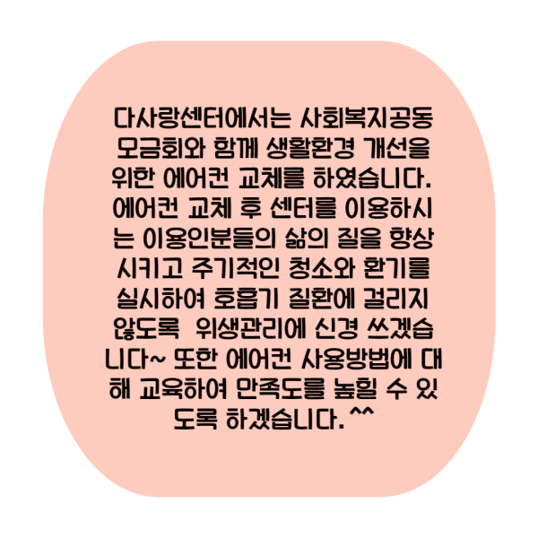 다사랑센터 생활환경 개선을 위한 에어컨 교체 작업 페이지 정보 작성자 유다솜 작성일24-09-04 19:10 조회810회 댓글0건 관련링크 본문 댓글목록 등록된 댓글이 없습니다. 이전글 다음글 목록