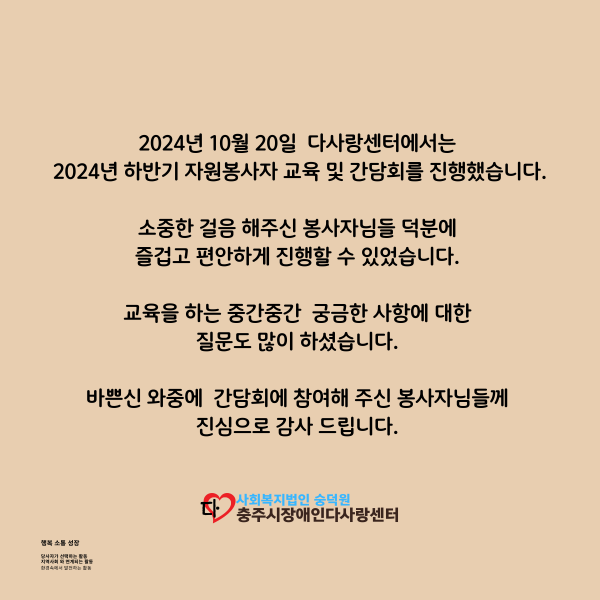 2024년 하반기 자원봉사 교육 및 간담회 페이지 정보 작성자 최월순 작성일24-10-20 18:30 조회715회 댓글0건 관련링크 본문 댓글목록 등록된 댓글이 없습니다. 이전글 다음글 목록