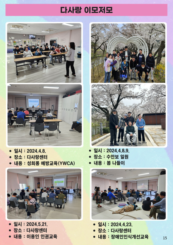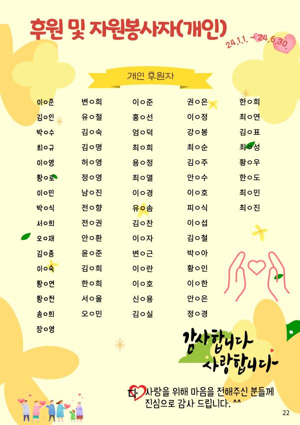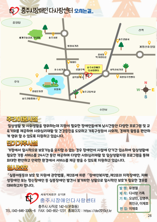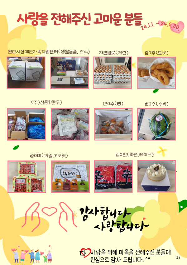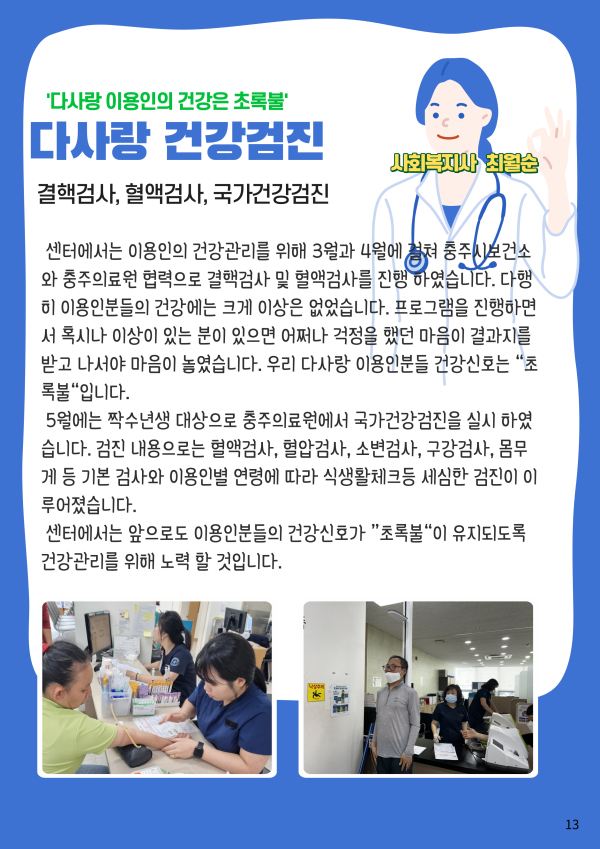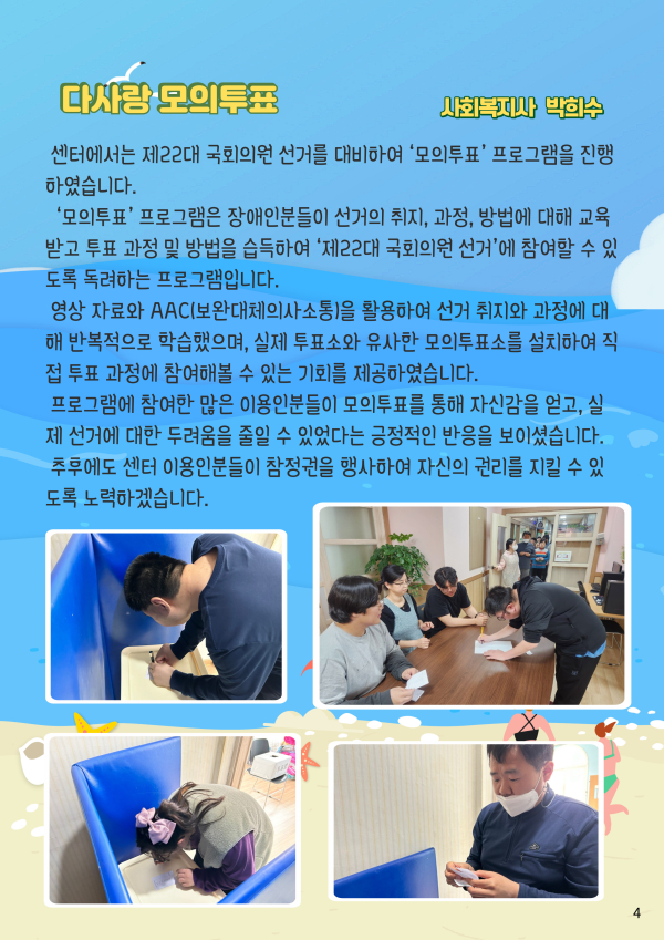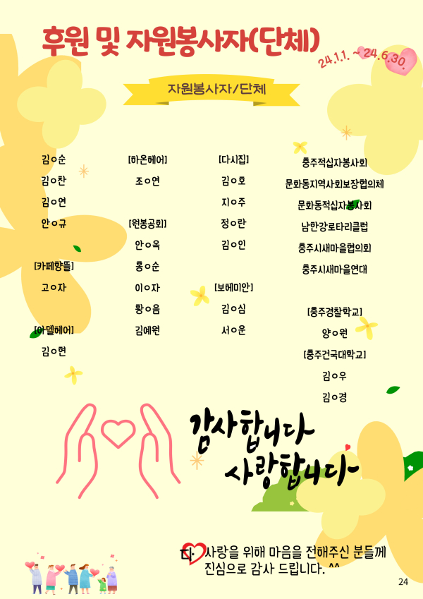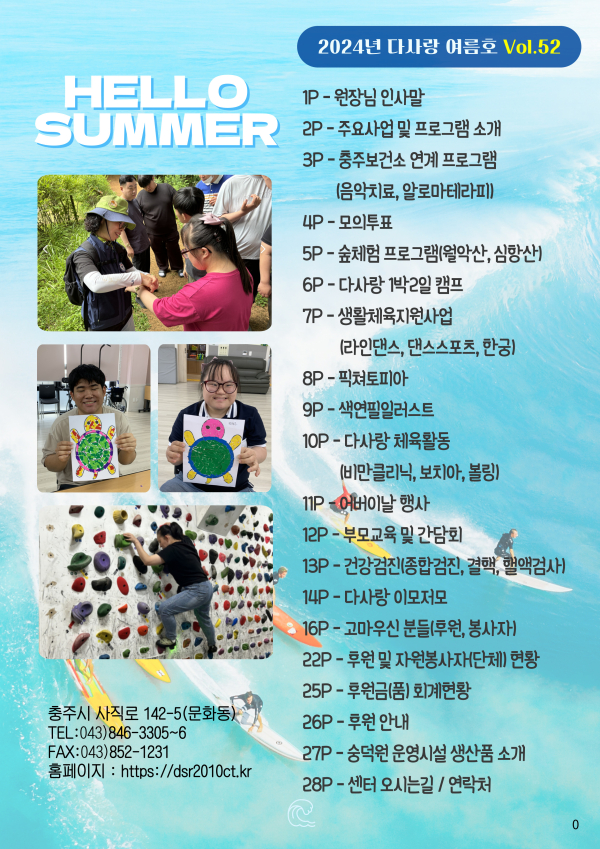 24년 여름호 (vol.52) 다사랑 뉴스레터 페이지 정보 작성자 이재호 작성일24-07-10 11:11 조회1,006회 댓글0건 관련링크 본문 2024년 2분기 소식지가 발행되었습니다. 항상 따뜻한 관심과 성원을 보내주신 여러분께 감사드립니다. 댓글목록 등록된 댓글이 없습니다. 이전글 다음글 목록