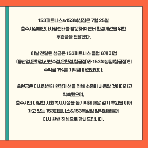 153피트니스&153복싱짐 건강한 여름나기 후원금 전달 페이지 정보 작성자 이하영 작성일24-07-25 16:42 조회1,017회 댓글0건 관련링크 본문 댓글목록 등록된 댓글이 없습니다. 이전글 다음글 목록