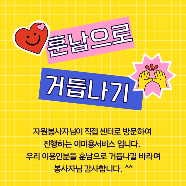 2024. 8. 13.(화) 이미용서비스 페이지 정보 작성자 최월순 작성일24-08-16 20:24 조회879회 댓글0건 관련링크 본문 댓글목록 등록된 댓글이 없습니다. 이전글 다음글 목록