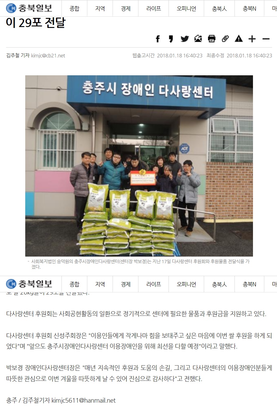 <충북일보> 다사랑후원회 충주시장애인다사랑센터 "쌀" 후원 페이지 정보 작성자 박보경 작성일18-01-25 00:21 조회3,722회 댓글0건 관련링크 본문 댓글목록 등록된 댓글이 없습니다. 이전글 다음글 목록