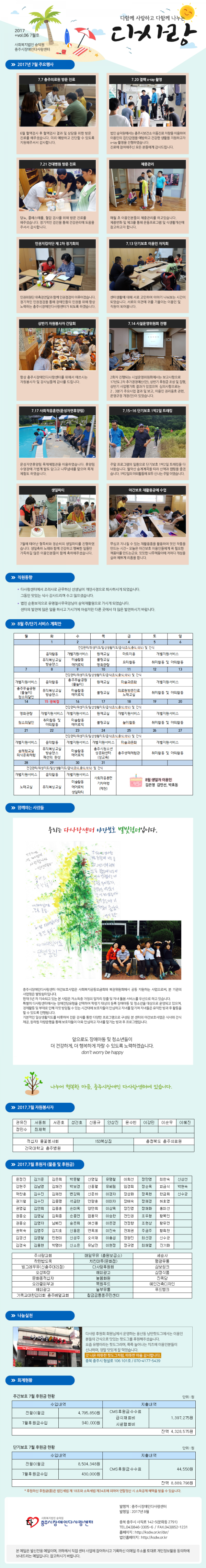 17년 7월호 (vol.6) 다사랑 뉴스레터 페이지 정보 작성자 김영실 작성일17-08-08 06:29 조회1,277회 댓글0건 관련링크 본문 댓글목록 등록된 댓글이 없습니다. 이전글 다음글 목록