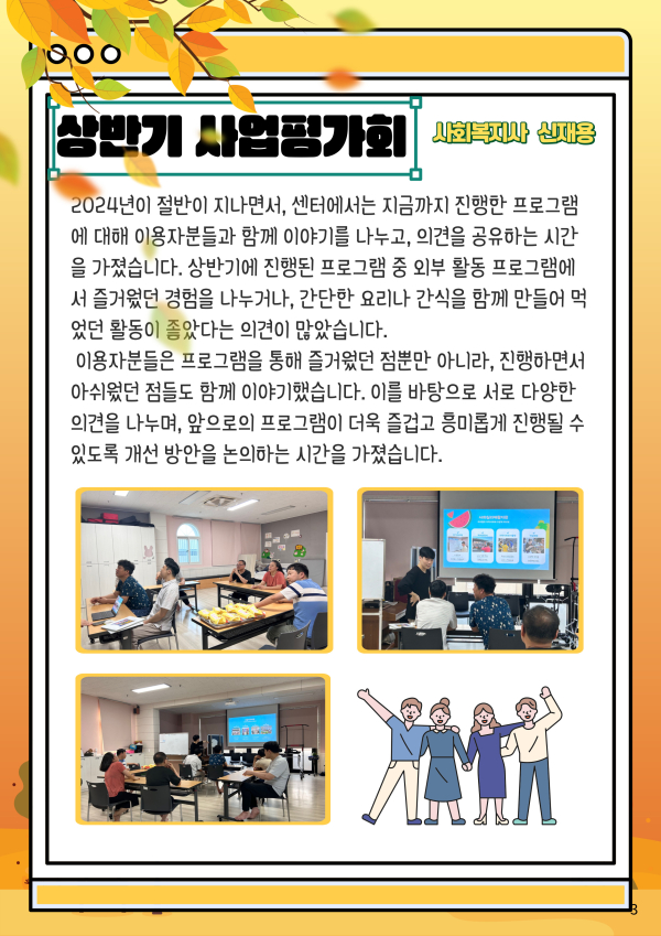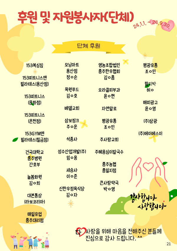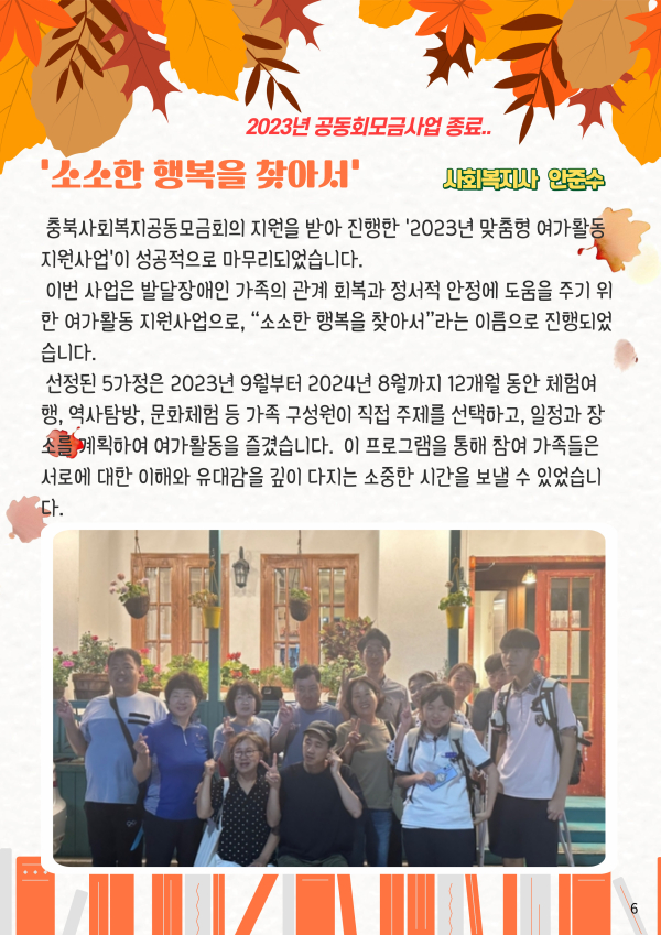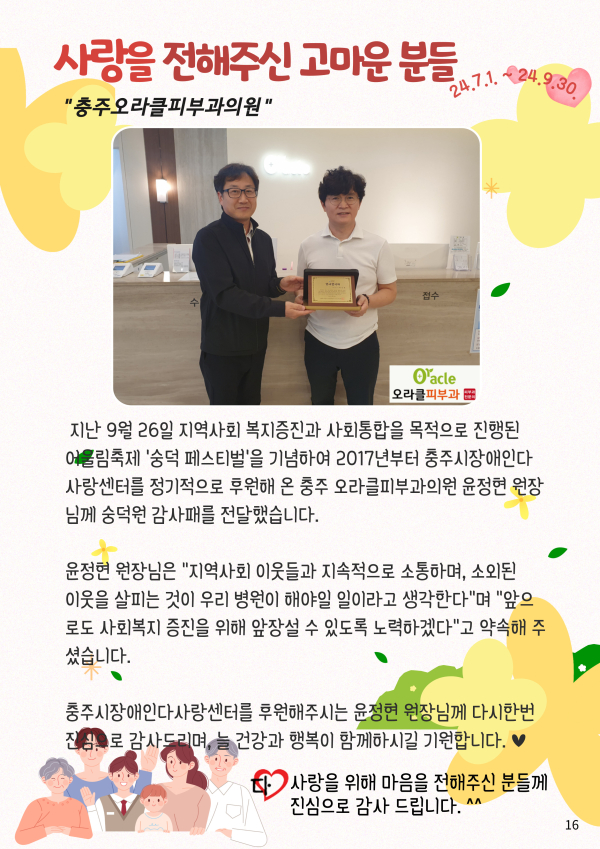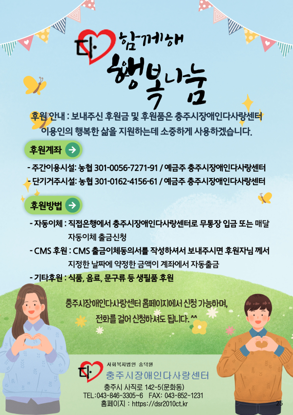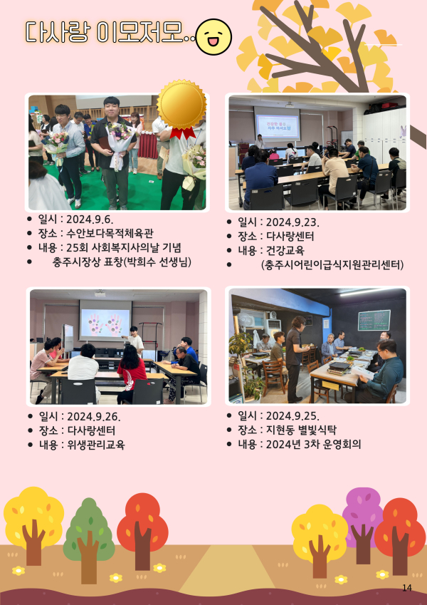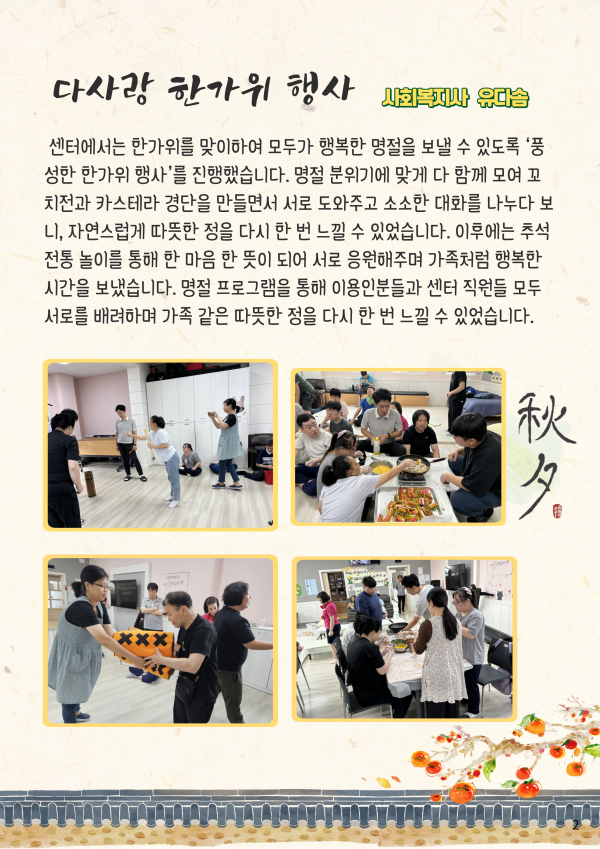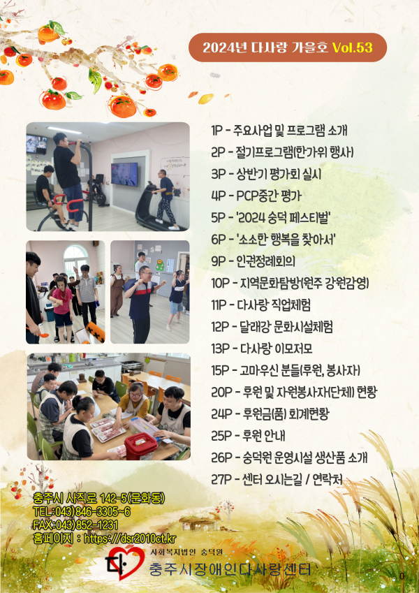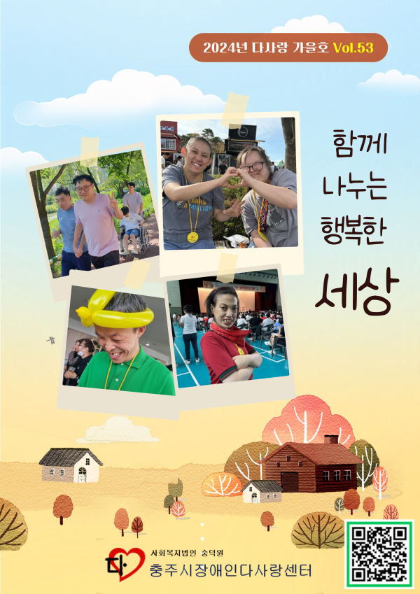 24년 가을호 (vol.53) 다사랑 뉴스레터 페이지 정보 작성자 이재호 작성일24-10-14 10:21 조회637회 댓글0건 관련링크 본문 2024년 3분기 소식지가 발행되었습니다. 항상 따뜻한 관심과 성원을 보내주신 여러분께 감사드립니다. 댓글목록 등록된 댓글이 없습니다. 이전글 다음글 목록
