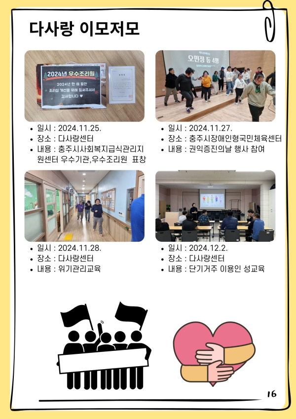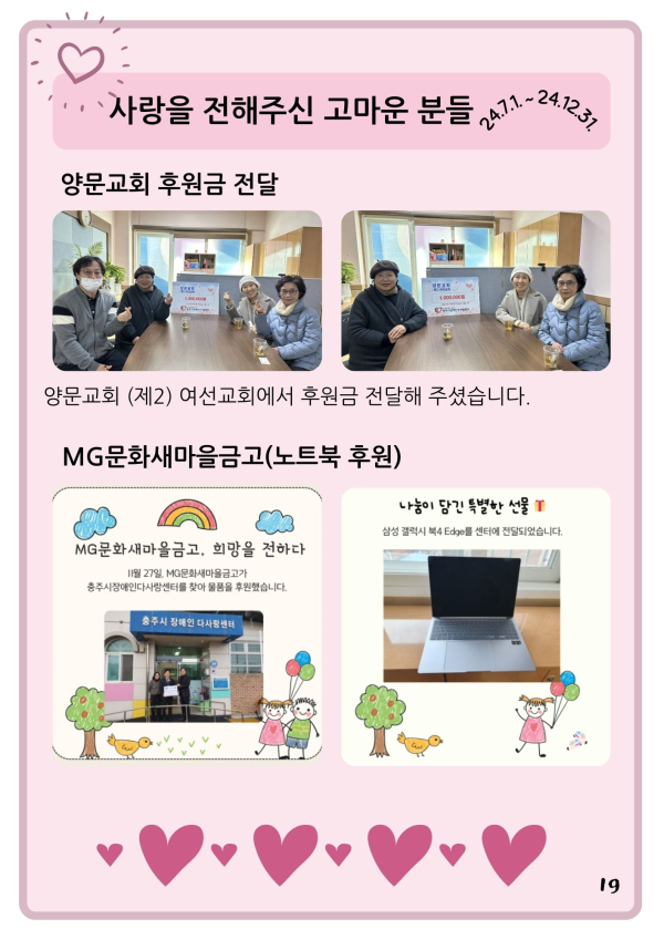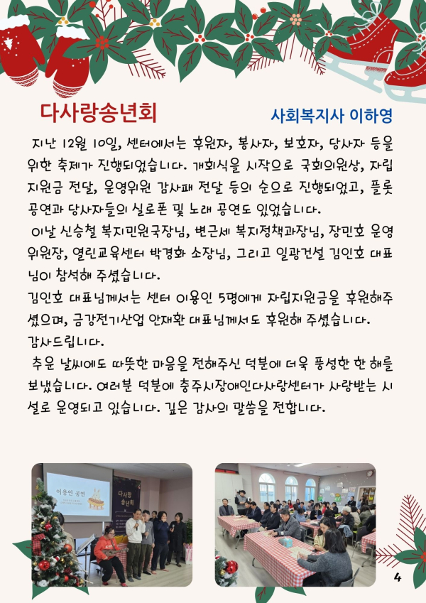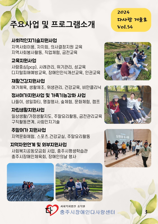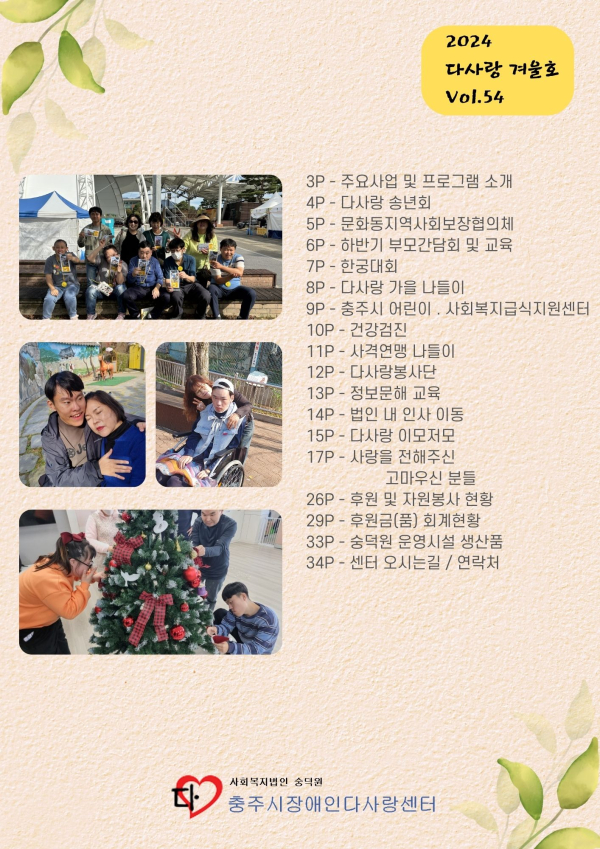 24년 겨울호(vol.54) 다사랑 뉴스레터 페이지 정보 작성자 최월순 작성일25-01-10 14:37 조회589회 댓글0건 관련링크 본문 2024년 다사랑 뉴스레터 '겨울호' 가 발행되었습니다. 지난 한해 큰 관심 가져주신 모든분들께 진심으로 감사드립니다. 댓글목록 등록된 댓글이 없습니다. 이전글 다음글 목록