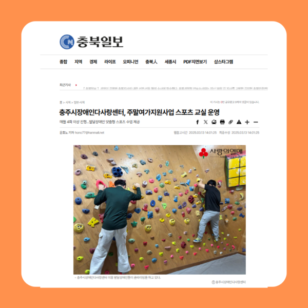[충북일보] 충주시장애니다사랑센터는 202년 충북사회복지공동모금회 지원사업에 선정, 장애인을 위한 스포츠체험 프로그램으로 클라이밍과 볼링 교실을 운영하고 있다.