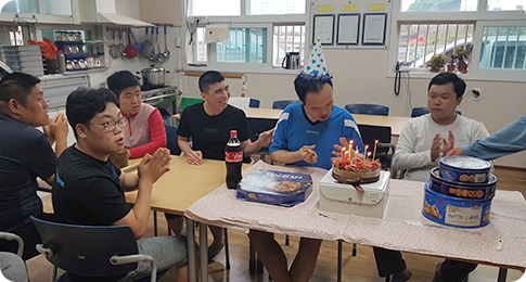 전체이용인이함께모여서생일축하자리를마련하고케익을나누고선물증정 | ||